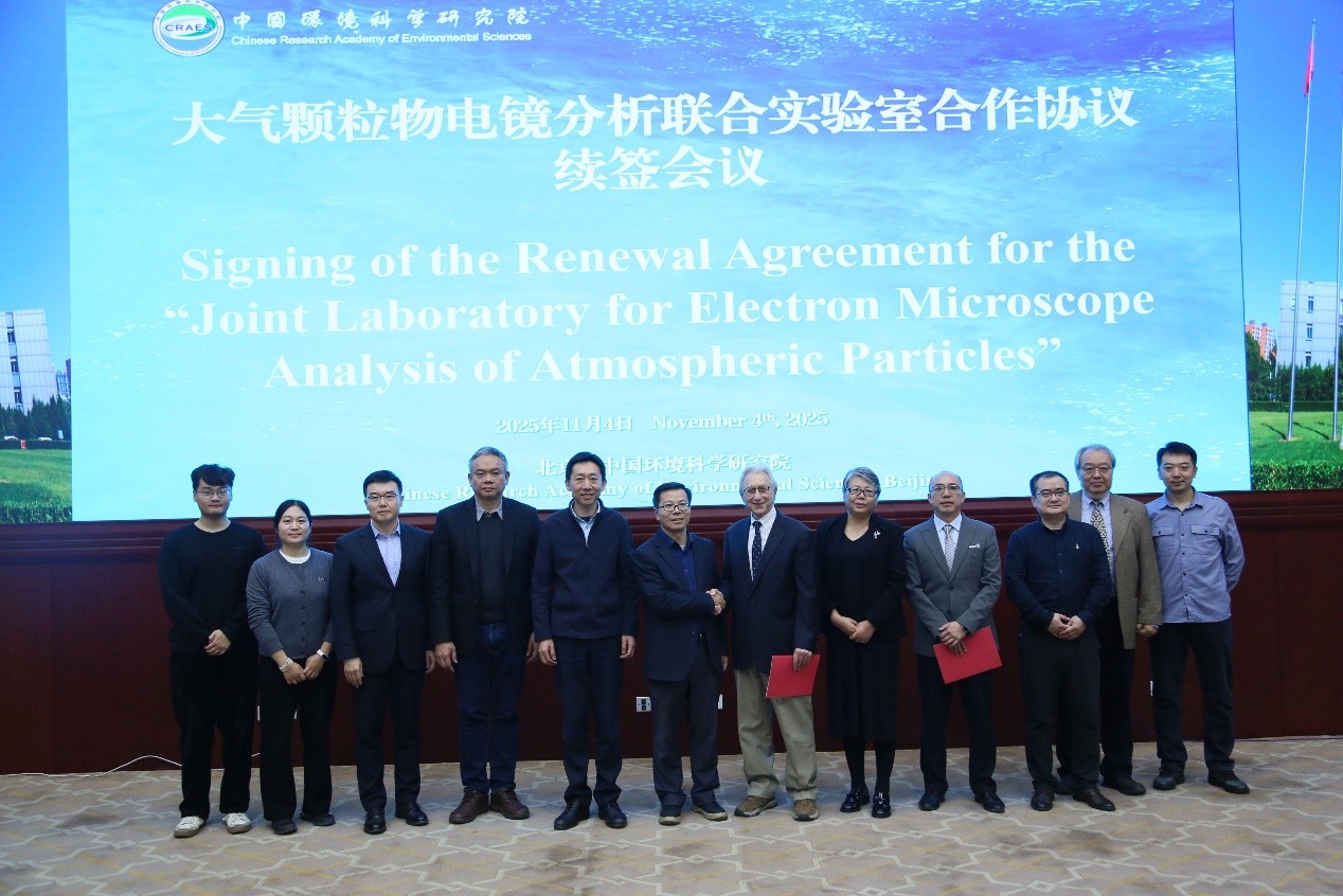 2025年11月4日, (以下简称中国环科院)与美国R.J. Lee集团、北京迈特高科技术有限公司举行“大气颗粒物电镜分析联合实验室”(以下简称联合实验室)三方合作协议续签仪式。中国环科院副院长陈胜,美国R.J. Lee集团副总裁Gary S. Casuccio、高级科学家李龙,北京迈特高科技术有限公司董事长陈锋、总经理李江等出席签约仪式。会议由中国环科院大气所所长胡京南主持。