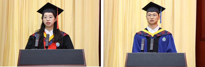 (左)博士毕业生代表牛琳发言/(右)硕士毕业生代表李世龙发言